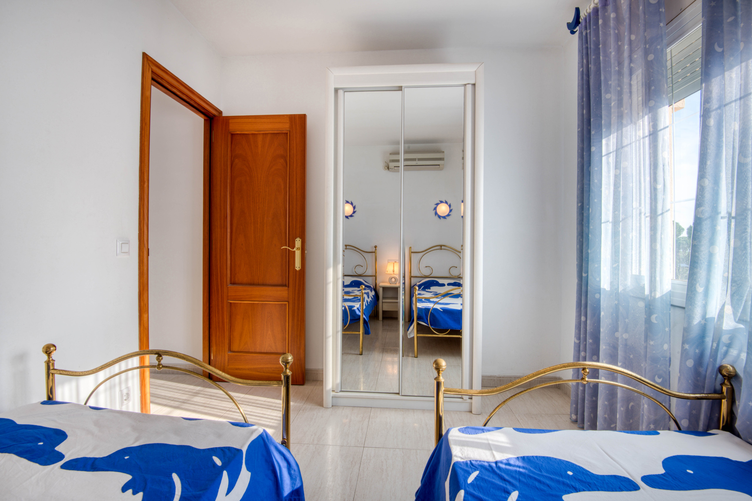 En la planta superior se encuentran las tres habitaciones; dos habitaciones con cama de matrimonio y una con dos camas individuales, todas ellas equipadas con aire acondicionado. Esta planta dispone de un baño completo con bañera y una salida exterior que da a la terraza superior.