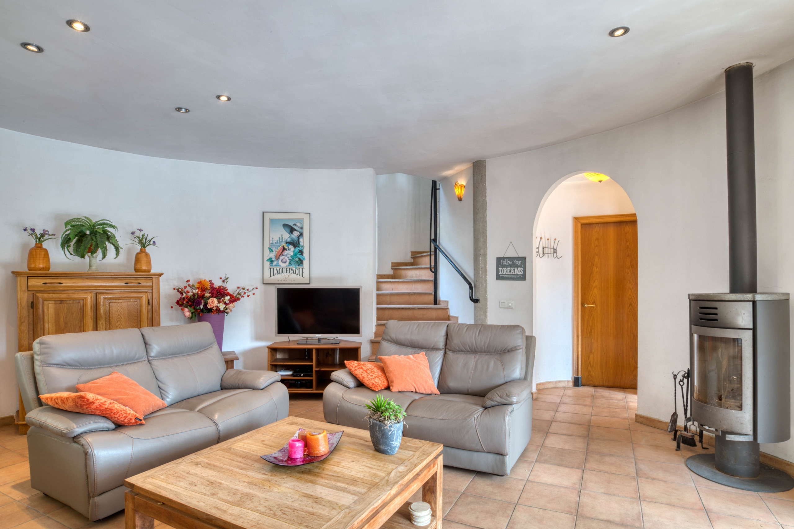 La casa tiene una superfície de 140 m2 que se dividen en dos plantas. En la planta baja encontramos una cocina abierta equipada con lavaplatos, un gran salón-comedor con chimenea y acceso directo a la terraza cubierta exterior con vistas a la piscina. En la misma planta principal hay un aseo. Mediante una escalera de caracol se llega a la planta superior compuesta de: cuatro dormitorios dobles y 3 tres cuartos de baño (dos con ducha y uno con bañera).