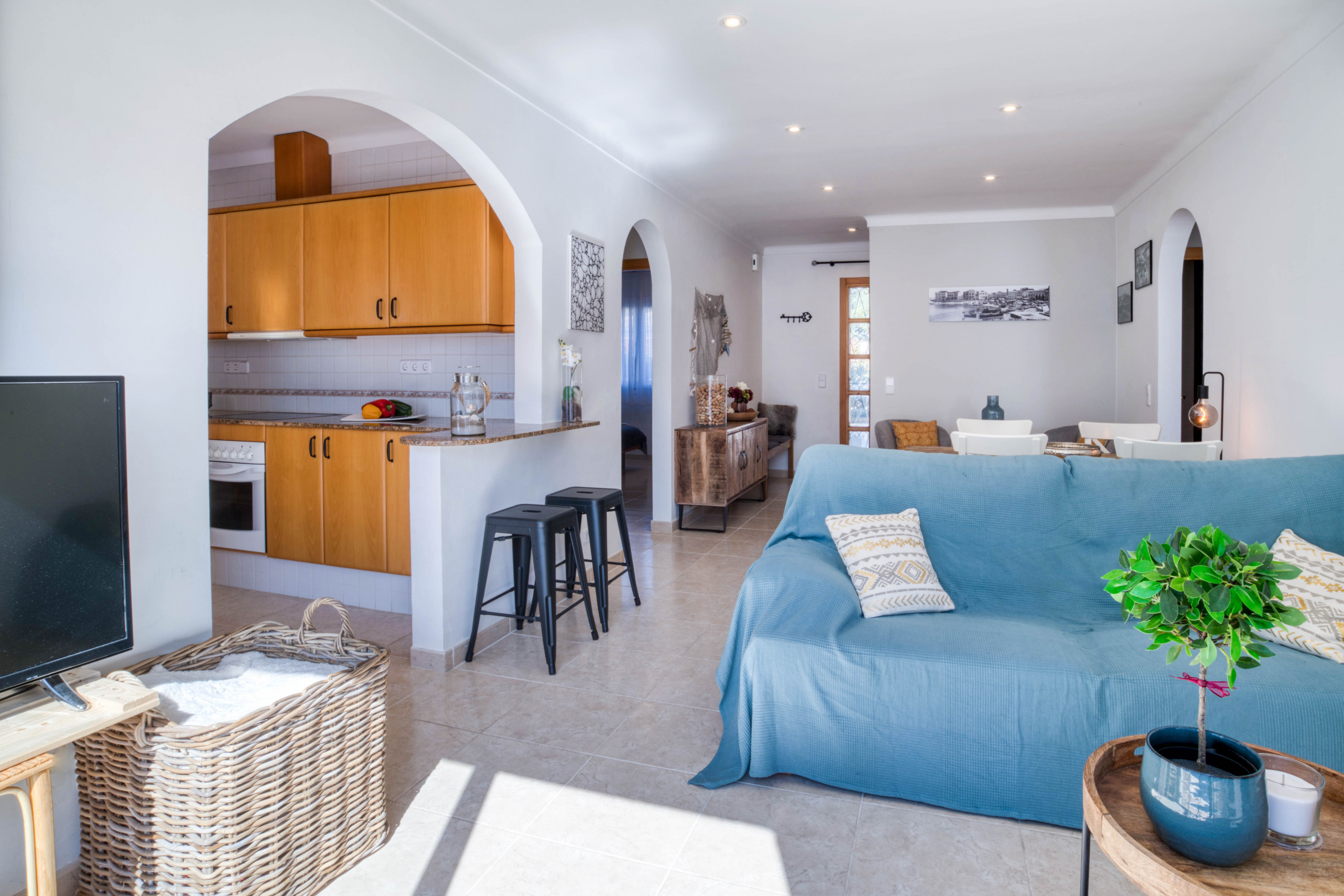 El interior de la casa te encantará. Está decorado con gusto y es una casa muy acogedora. Toda la casa es de planta baja por lo que es también muy cómoda. Entramos por la puerta principal y encontramos un recibidor que nos lleva a la estancia principal del salón-comedor, con grandes ventanales con vistas y salida a la piscina privada. La cocina es abierta y se separa del salón-comedor con una pequeña barra estilo americana con dos taburetes. Dispone de tres grandes dormitorios, todas con armarios y aire acondicionado reversible. A mano izquierda, un dormitorio con dos camas individuales, un baño completo con ducha y un segundo dormitorio con cama de matrimonio. A mano derecha, el tercer dormitorio tipo suite con cama de matrimonio y baño completo con bañera dentro de la misma habitación.