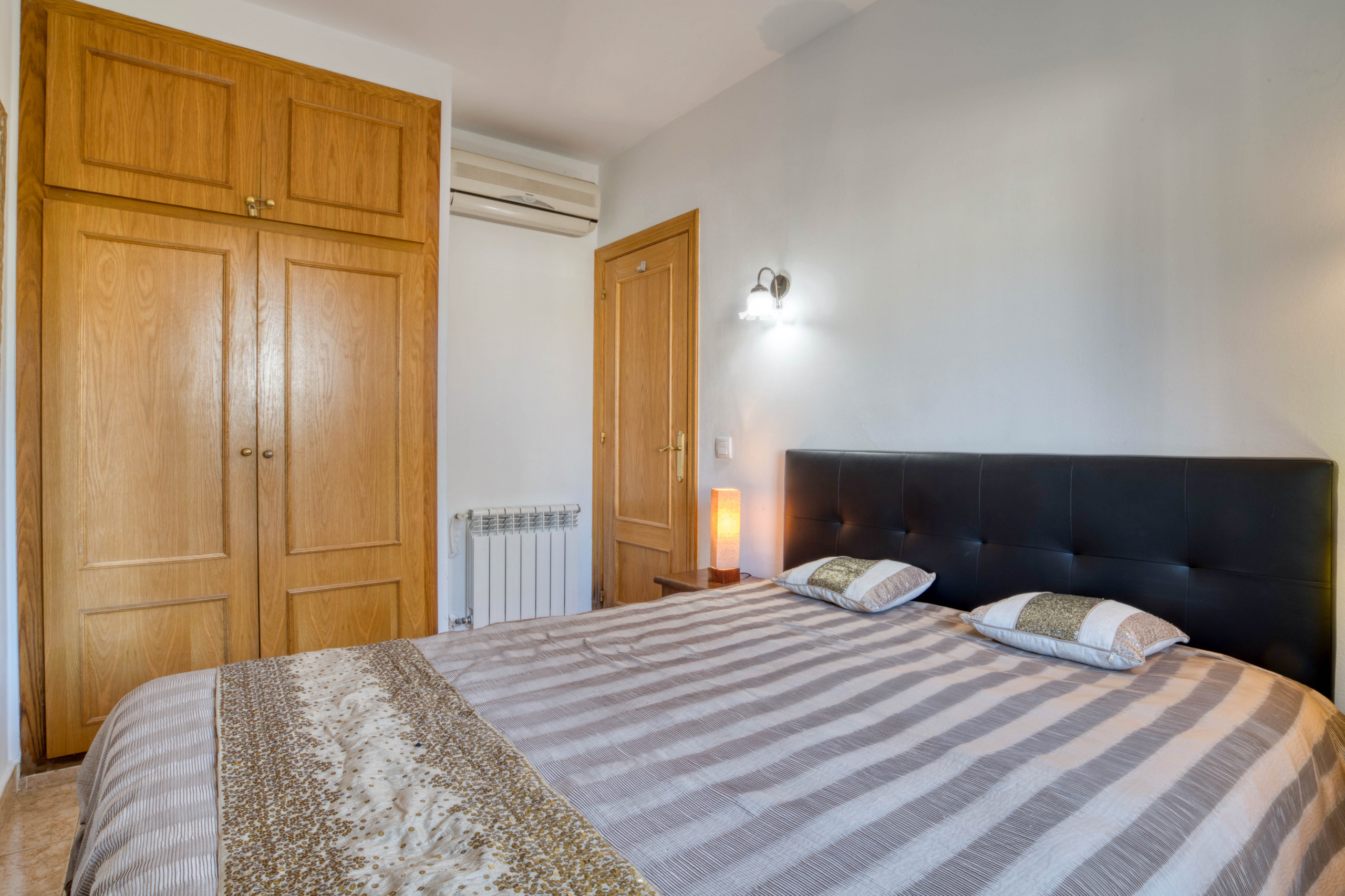 El interior de la casa se divide en dos plantas. En la planta baja, una amplia cocina independiente totalmente equipada, el salón-comedor, un baño con ducha y un dormitorio doble con cama de matrimonio y armario. En esta planta dispone de un aparato de aire acondicionado en el dormitorio. Las escaleras nos llevan a la primera planta donde encontramos: un dormitorio con dos camas individuales y un armario; un segundo dormitorio con cama de matrimonio, armarios y salida al balcón de la planta superior, con vistas a la piscina; un tercer dormitorio también con cama de matrimonio, armarios y salida al balcón; y por último un baño completo con bañera. En esta planta hay tres aparatos de aire acondicionado, uno en cada dormitorio.