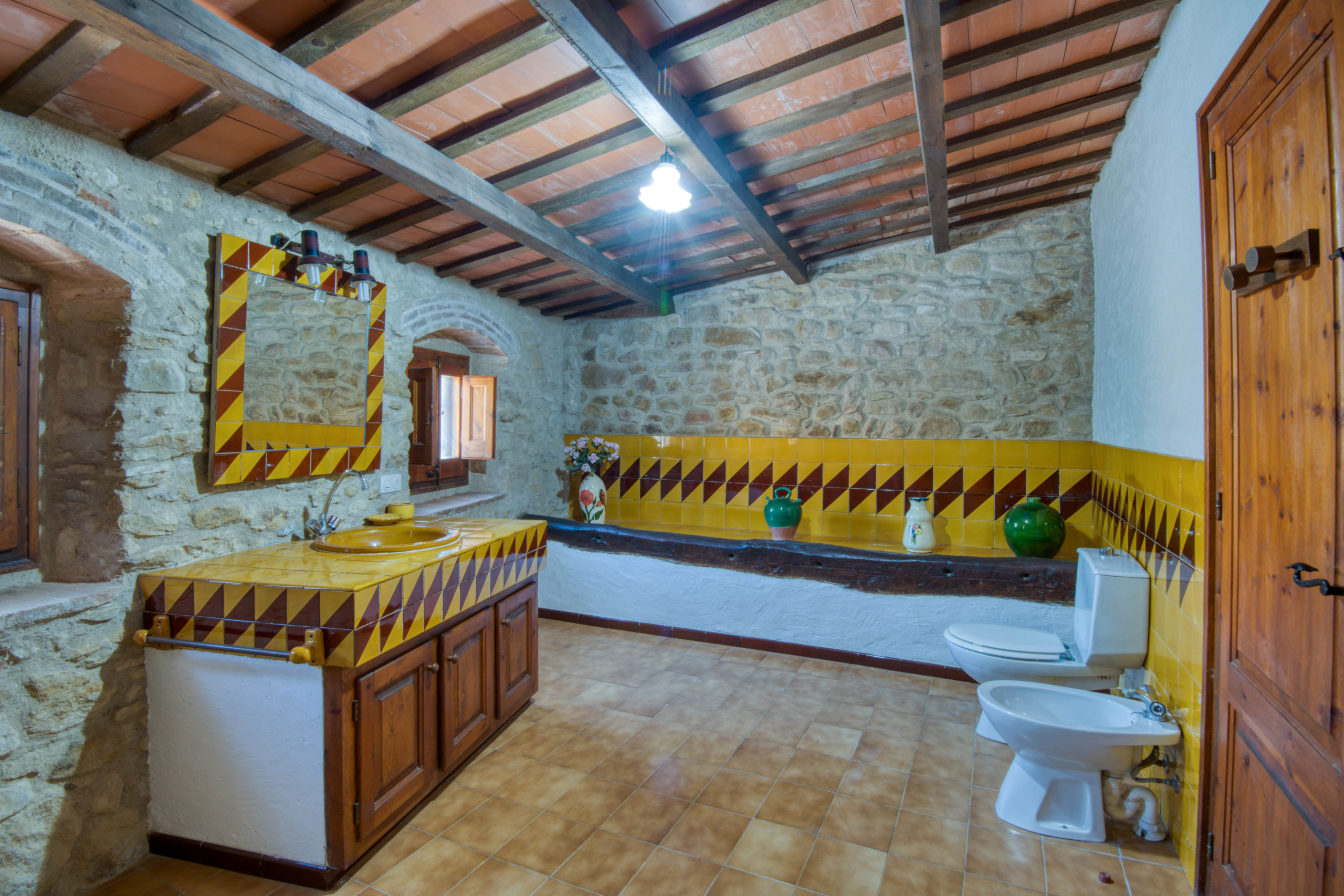 En la planta baja de la masía, una gran cocina-comedor, tres salones distintos, un baño con bañera y una estancia equipada con una mesa de ping-pong. Subiendo unas escaleras, a mediana altura, se encuentra el dormitorio principal conformado por una gran suite: un salón, el dormitorio con cama de matrimonio y un baño con ducha.