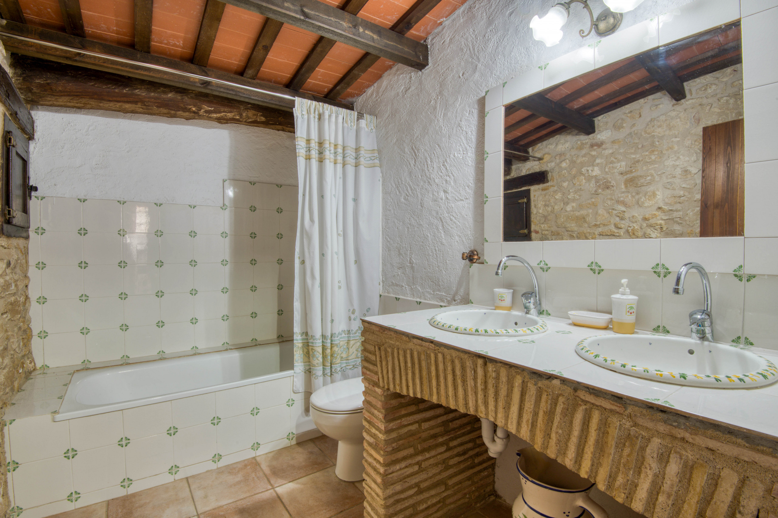 La primera planta nos recibe con un amplio salón desde el que podemos acceder a cualquiera de las cuatro habitaciones. Tres dormitorios con cama de matrimonio, un dormitorio con dos camas individuales y un baño con bañera. Desde el salón también se accede a una terraza-balcón en la parte superior de la masía.