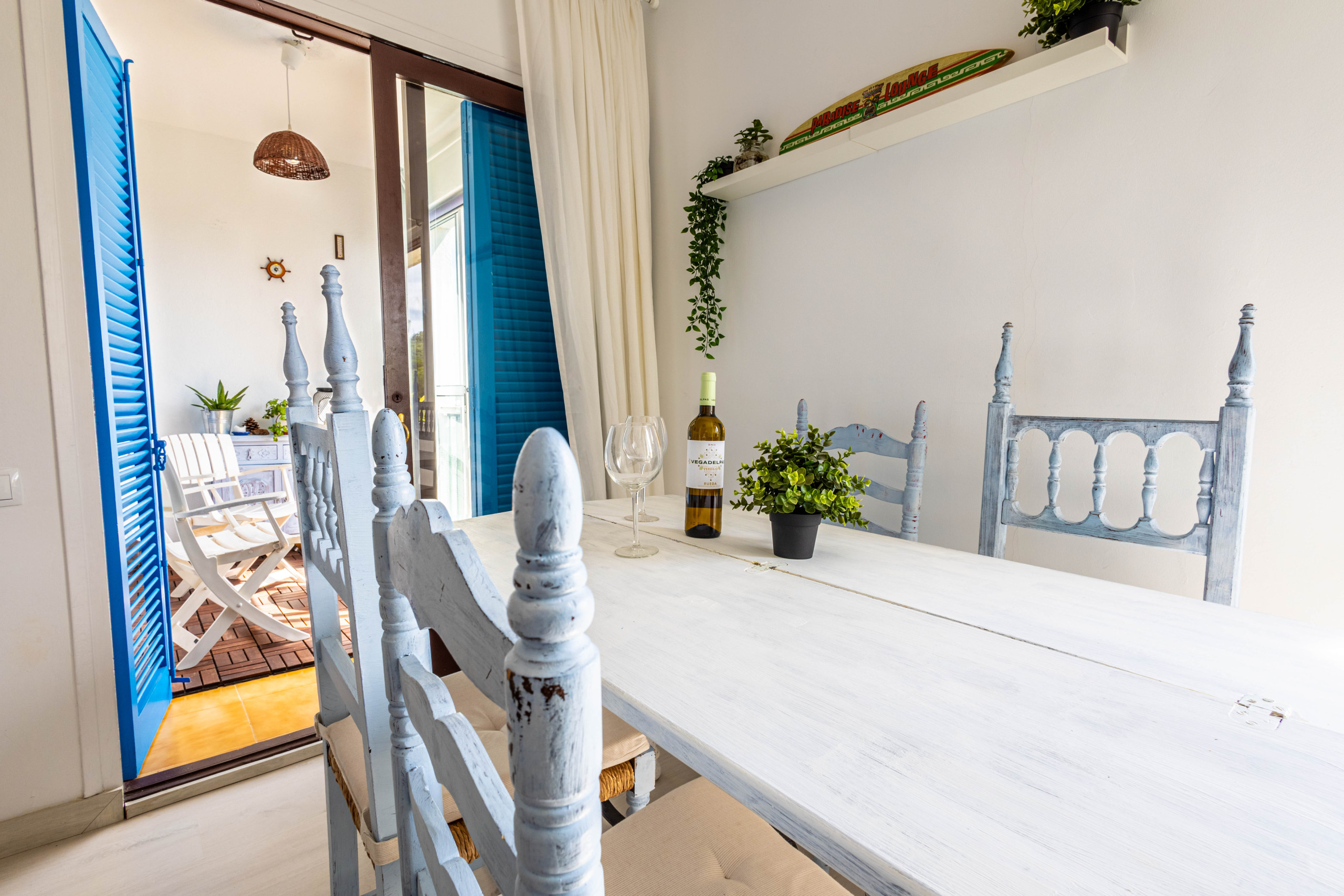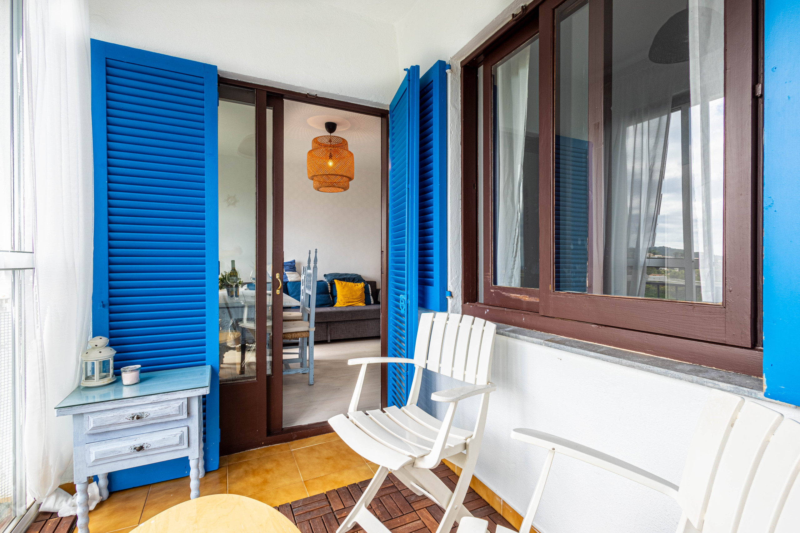 L'interior està pensat per aprofitar al màxim les impressionants vistes al mar. L'apartament compta amb un espai diàfan que integra cuina, menjador i sala d'estar, amb sortida directa al balcó. Des d'aquí es gaudeix de vistes panoràmiques que s'estenen des del Parc Natural del Montgrí fins a les Illes Medes. La terrassa està equipada amb una taula i dues cadires d'exterior, perfecta per esmorzar o relaxar-se al capvespre.
