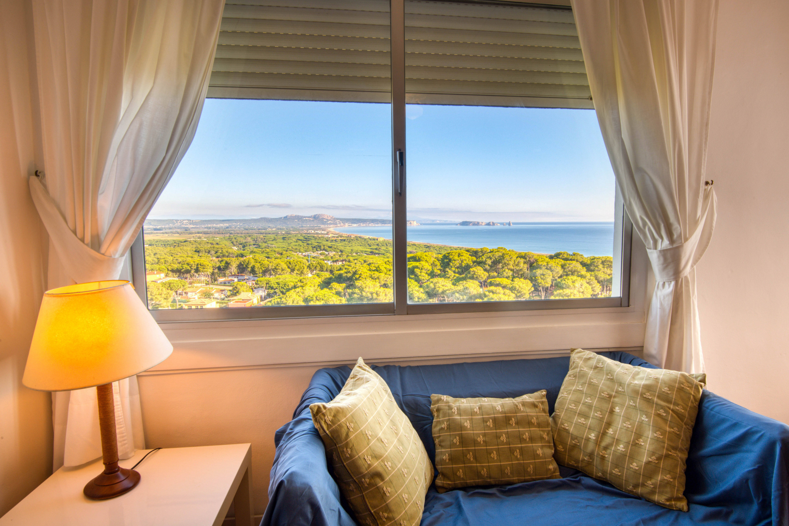 L´apartament està dissenyat per aprofitar al màxim la seva vista al mar. Disposa d´un ampli espai que comparteixen cuina, menjador i saló, amb una sortida directa al balcó. Aquesta estada té vista sobre el parc natural del Montgrí fins a les Illes Medes. La terrassa està equipada amb una tauleta exterior i dues cadires. El dormitori principal té un llit de matrimoni i armaris, des de la finestra es pot veure el mar. El segon dormitori és ampli i està equipada amb una llitera que té un matalàs per a dues persones a la part inferior, i un llit individual a la part superior. També disposa d´armaris perquè puguin emmagatzemar totes les seves pertinences. Finalment, un bany complet amb dutxa. La zona comunitària és tranquil·la i disposa de parc infantil i una gran piscina molt ben cuidada. També té una zona de pàrquing comunitari.