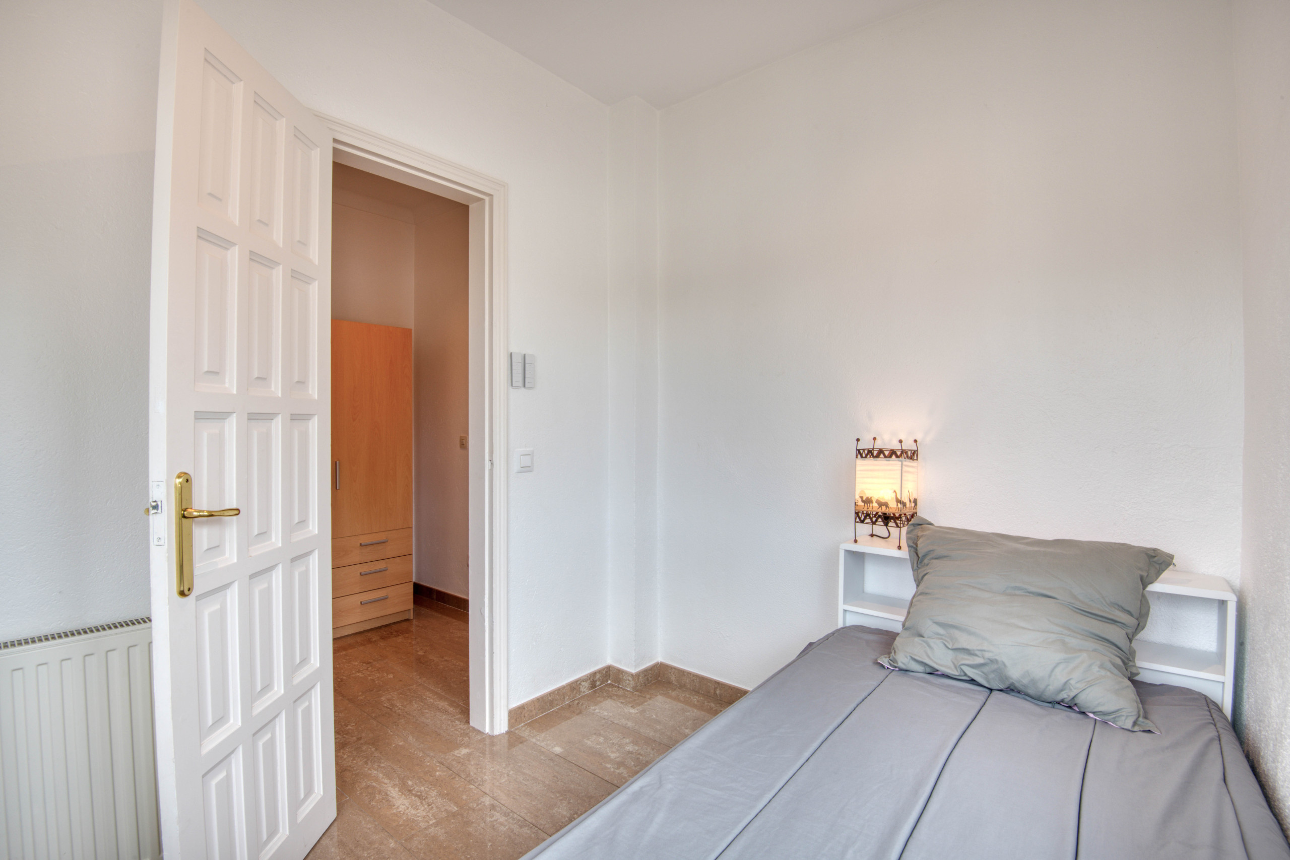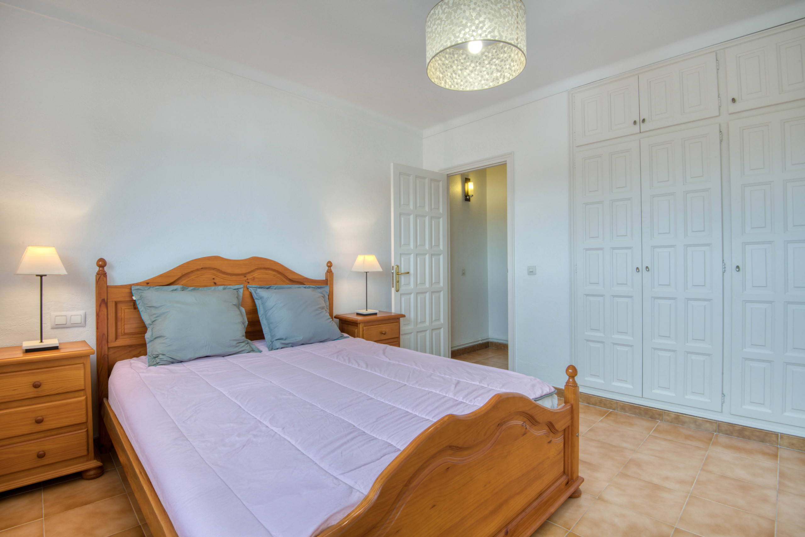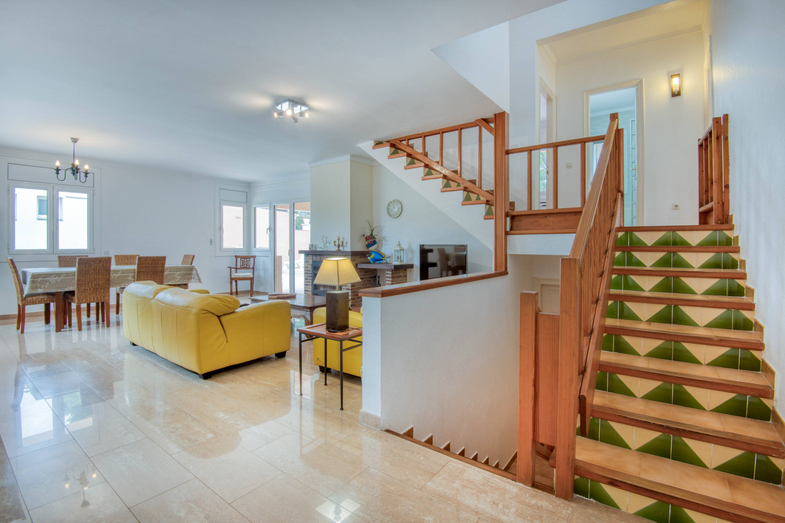 L´interior de la casa es divideix en dues plantes. A la planta baixa, una àmplia cuina independent totalment equipada, el saló-menjador, un bany amb dutxa i un dormitori doble amb llit de matrimoni i armari. En aquesta planta disposa d´un aparell d´aire condicionat al dormitori. Les escales ens porten a la primera planta on trobem: un dormitori amb dos llits individuals i un armari; un segon dormitori amb llit de matrimoni, armaris i sortida al balcó de la planta superior, amb vista a la piscina; un tercer dormitori també amb llit de matrimoni, armaris i sortida al balcó; i per últim un bany complet amb banyera. En aquesta planta hi ha tres aparells d'aire condicionat, un dins de cada dormitori.