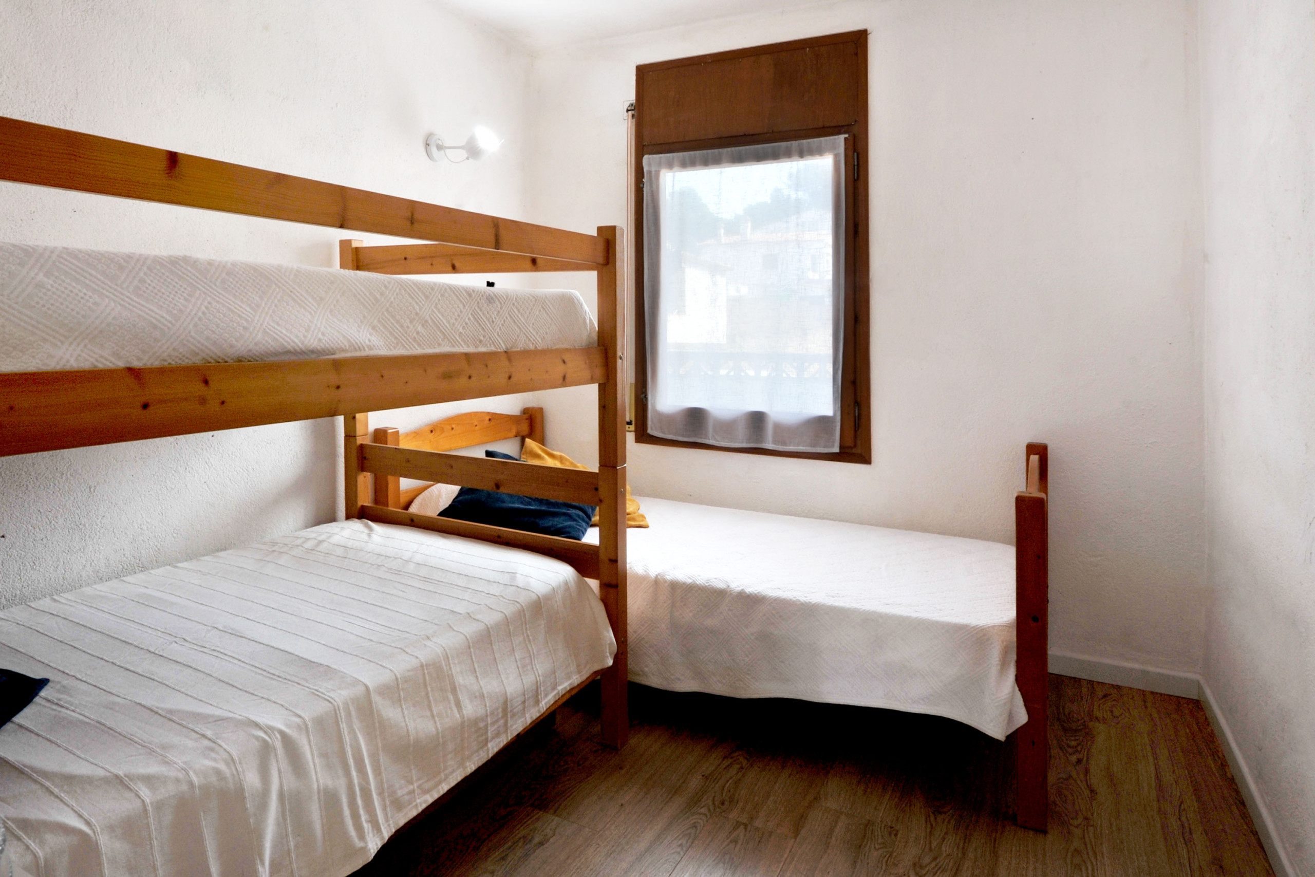 L'interior de la casa es troba a la primera planta, a la que s'accedeix mitjançant unes escales. Davant la porta d'entrada, una terrassa coberta amb barbacoa i vistes directes a la piscina. Al entrar trobem la sala d'estar-menjador i a mà esquerra una petita cuina. Una primera habitació amb llit de matrimoni, la segona amb una llitera i un llit individual, i per últim un lavabo amb dutxa que comparteixen ambdues habitacions. La casa disposa de televisió satèl·lit i wifi gratuït perquè les teves vacances a l'Escala siguin encara més confortables.