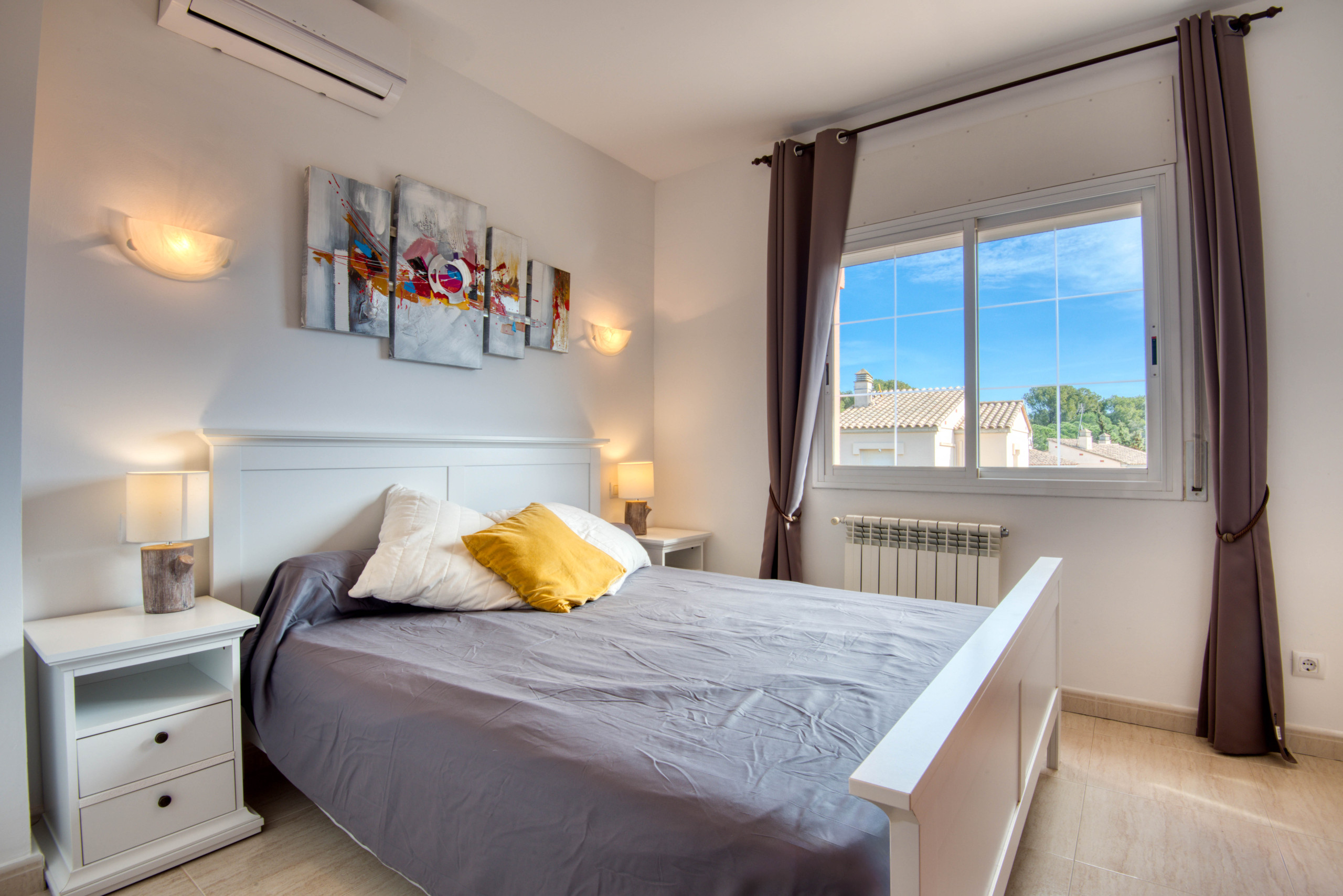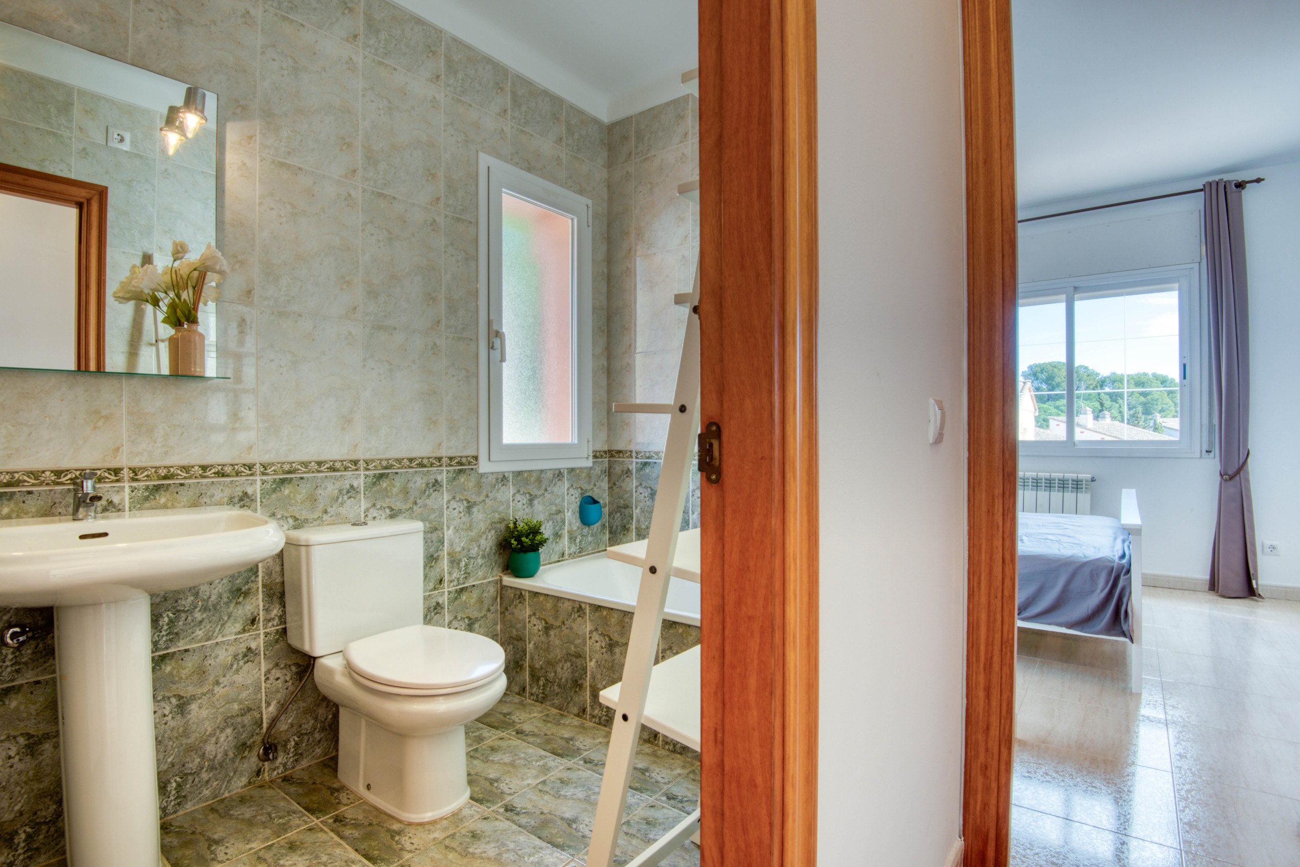 Im Obergeschoss befinden sich die drei Doppelzimmer, alle mit Doppelbett und Klimaanlage ausgestattet. In dieser Etage gibt es auch ein vollständiges Badezimmer mit Badewanne und einen direkten Zugang zur oberen Terrasse.