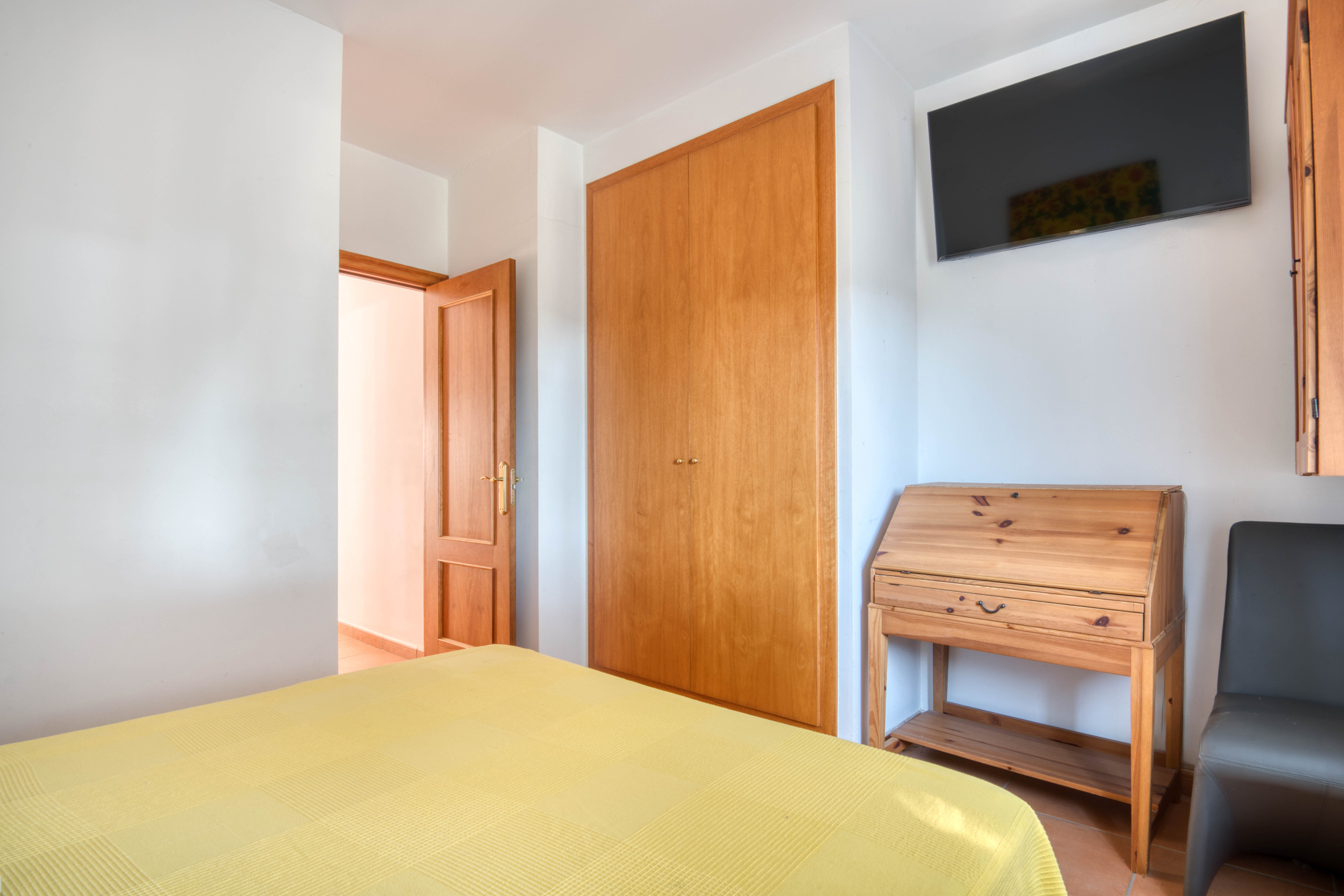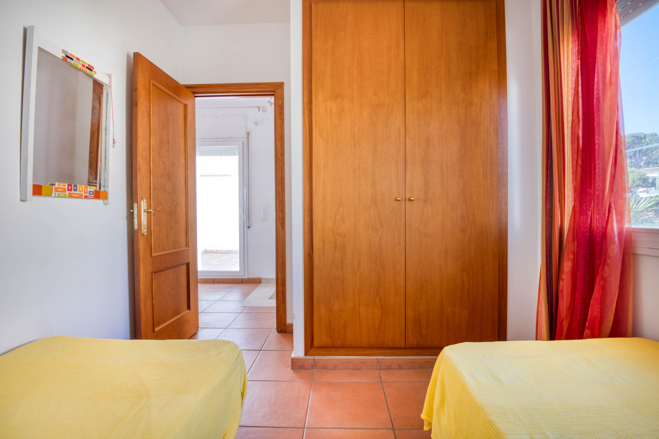 Im Obergeschoss befinden sich drei Zimmer: eines mit einem Doppelbett und zwei mit Einzelbetten. In diesem Stockwerk gibt es auch ein vollständiges Badezimmer mit Badewanne und direktem Zugang zur oberen Terrasse.