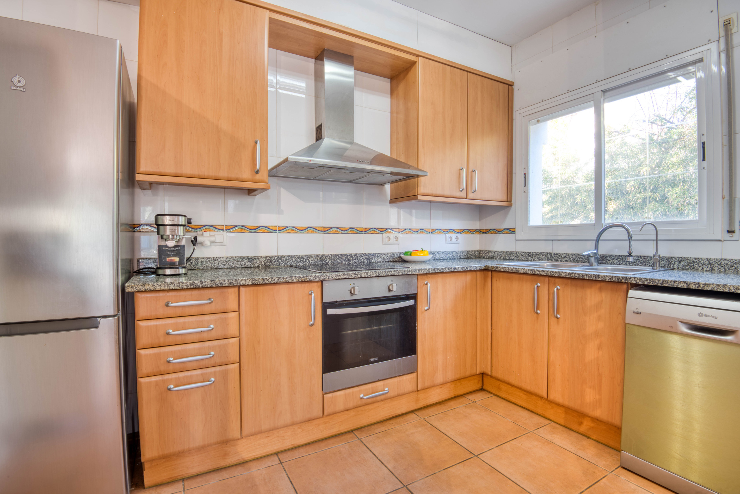 Wir betreten das Haus durch das Wohnzimmer, das sich den Raum mit dem Esszimmer teilt, von dem aus wir Zugang zu einem Flur haben, der uns zur Küche führt, die komplett mit antiken Schränken verschlossen ist, aber mit allem ausgestattet ist, was man für die Zubereitung guter Mahlzeiten und Frühstücke braucht. Derselbe Verteiler verbindet uns mit den Schlafzimmern, zwei davon mit einem Doppelbett und das dritte mit zwei Einzelbetten.