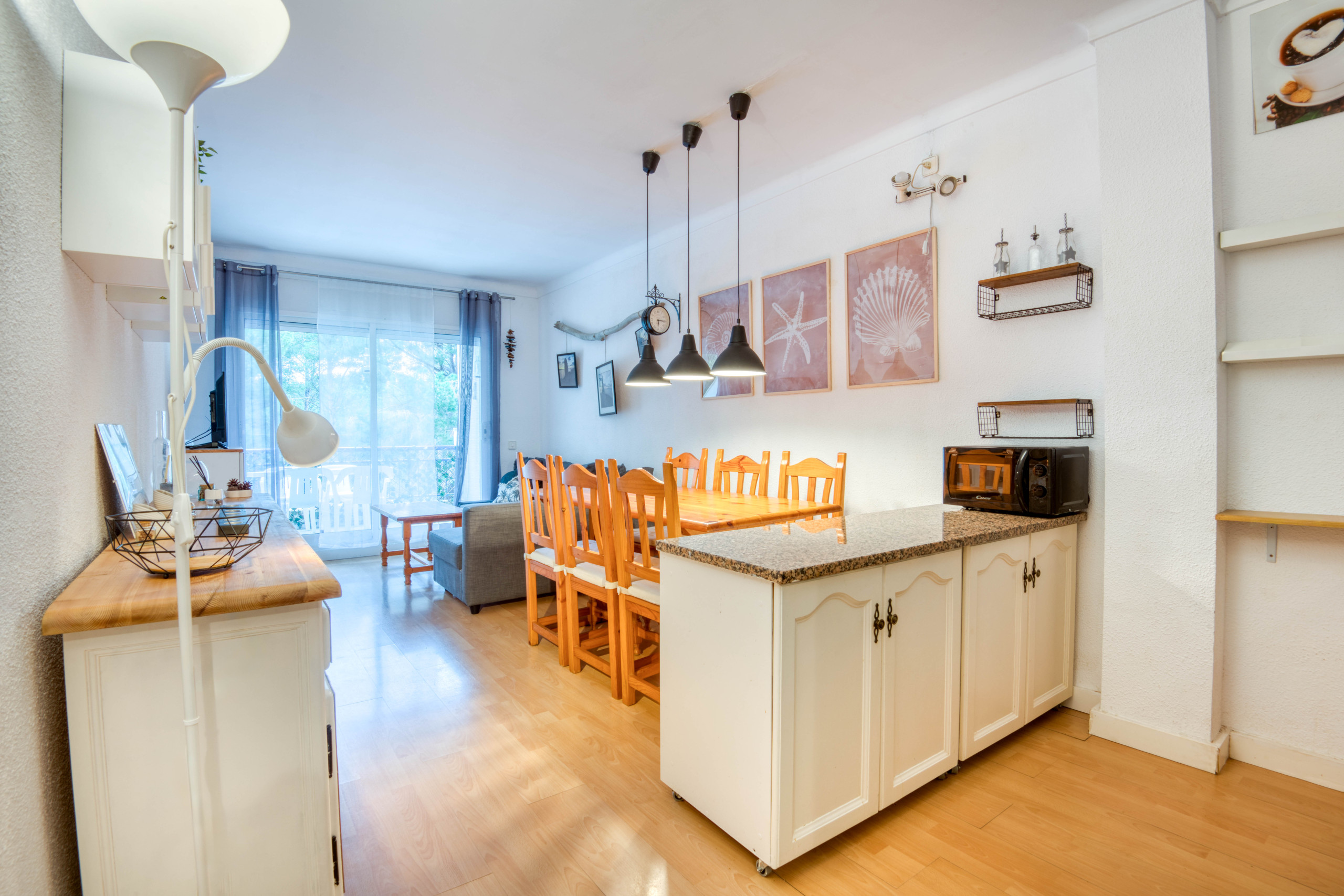 The apartment is located on the second floor, it is tastefully decorated and very cosy. We enter through the front door and find a hall that separates the day area from the night area. In the day area, a spacious room with the kitchen, which is separated from the dining room with an American bar, and the living-dining room. From this same room we access the terrace with views of the forest, equipped with outdoor furniture to enjoy breakfast, lunch and dinner outside. It also has a toilet. In the night area we find the two bedrooms, one with a double bed and the other with two single beds. Both bedrooms have fitted wardrobes. Also in this area is the full bathroom, equipped with a bathtub.