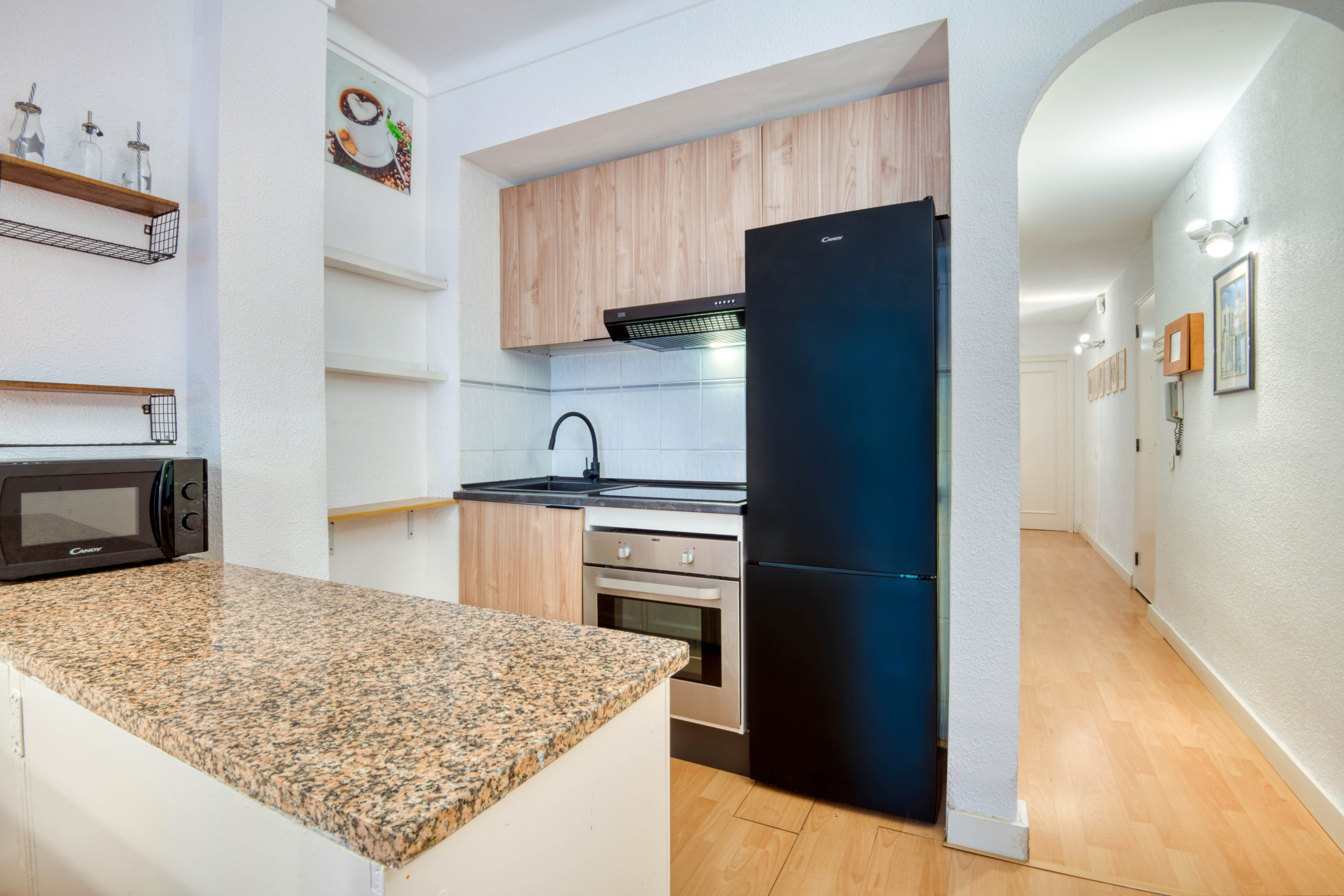 The apartment is completely renovated. It welcomes us with a spacious area that shares a beautiful fully equipped open kitchen, and the living-dining room with direct access to the terrace. It has two bedrooms and a bathroom with a shower. The first bedroom is equipped with a double bed and the second with single beds.