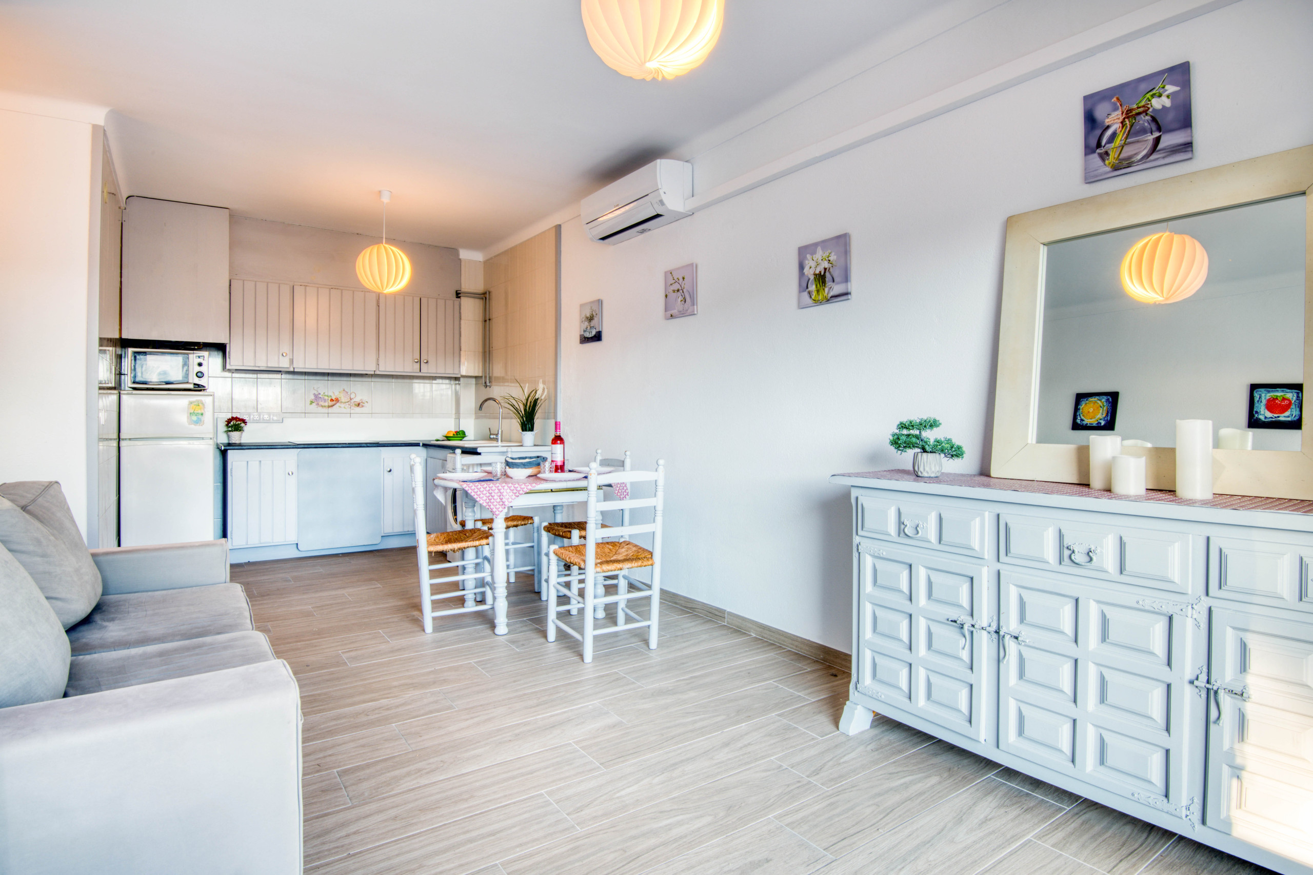 The apartment is completely renovated. It welcomes us with a spacious area that shares a beautiful fully equipped open kitchen, and the living-dining room with direct access to the terrace. It has two bedrooms and a bathroom with a shower. The first bedroom is equipped with a double bed and the second with single beds.