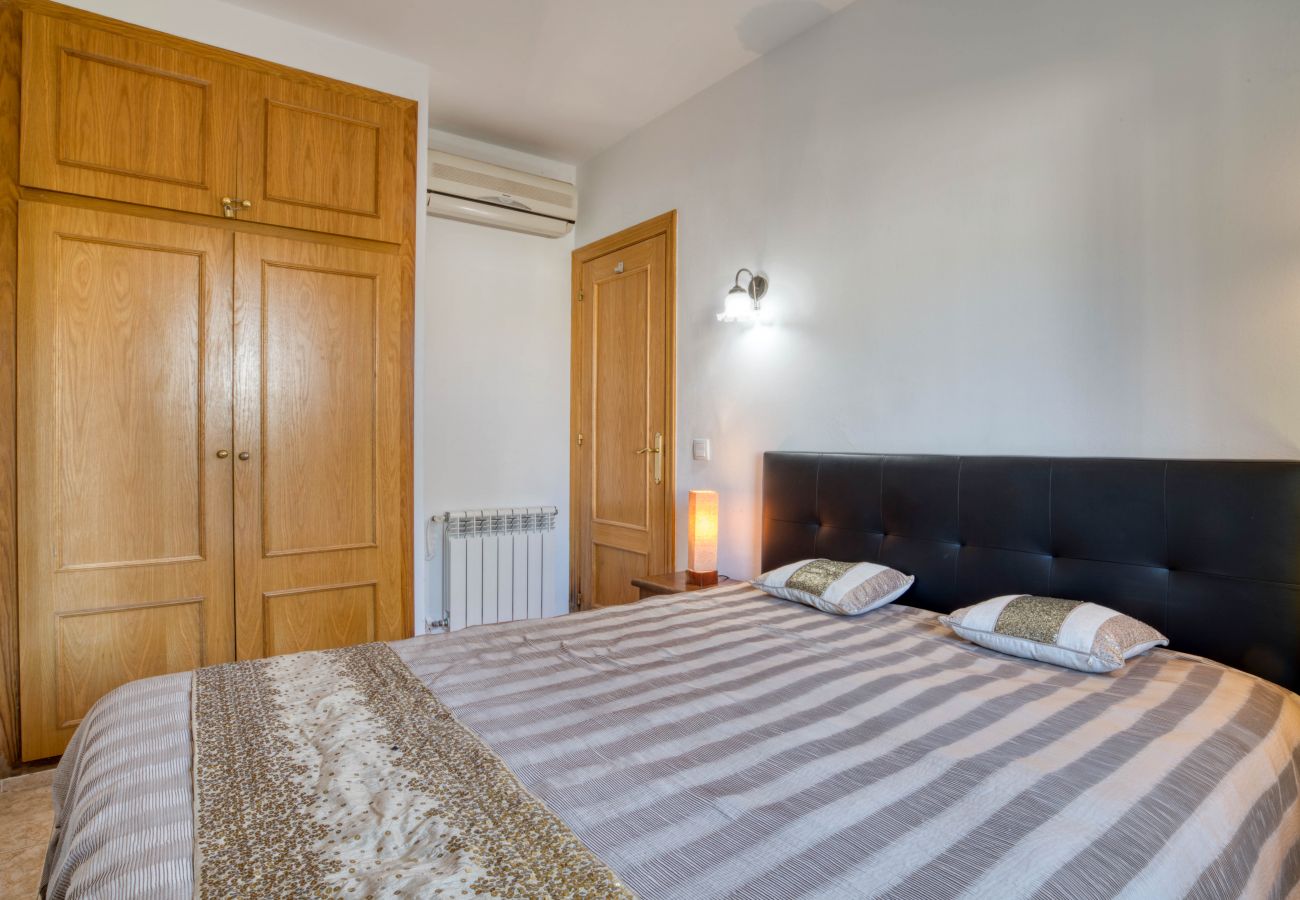 The interior of the house is divided into two floors. On the ground floor, a large fully equipped independent kitchen, the living-dining room, a bathroom with shower and a double bedroom with double bed and wardrobe. On this floor there is an air conditioning unit in the bedroom. The stairs lead us to the first floor where we find: a bedroom with two single beds and a wardrobe; a second bedroom with a double bed, wardrobes and access to the balcony on the upper floor, with views to the swimming pool; a third bedroom also with a double bed, wardrobes and access to the balcony; and finally a complete bathroom with bathtub. On this floor there are three air conditioning units, one in each bedroom.