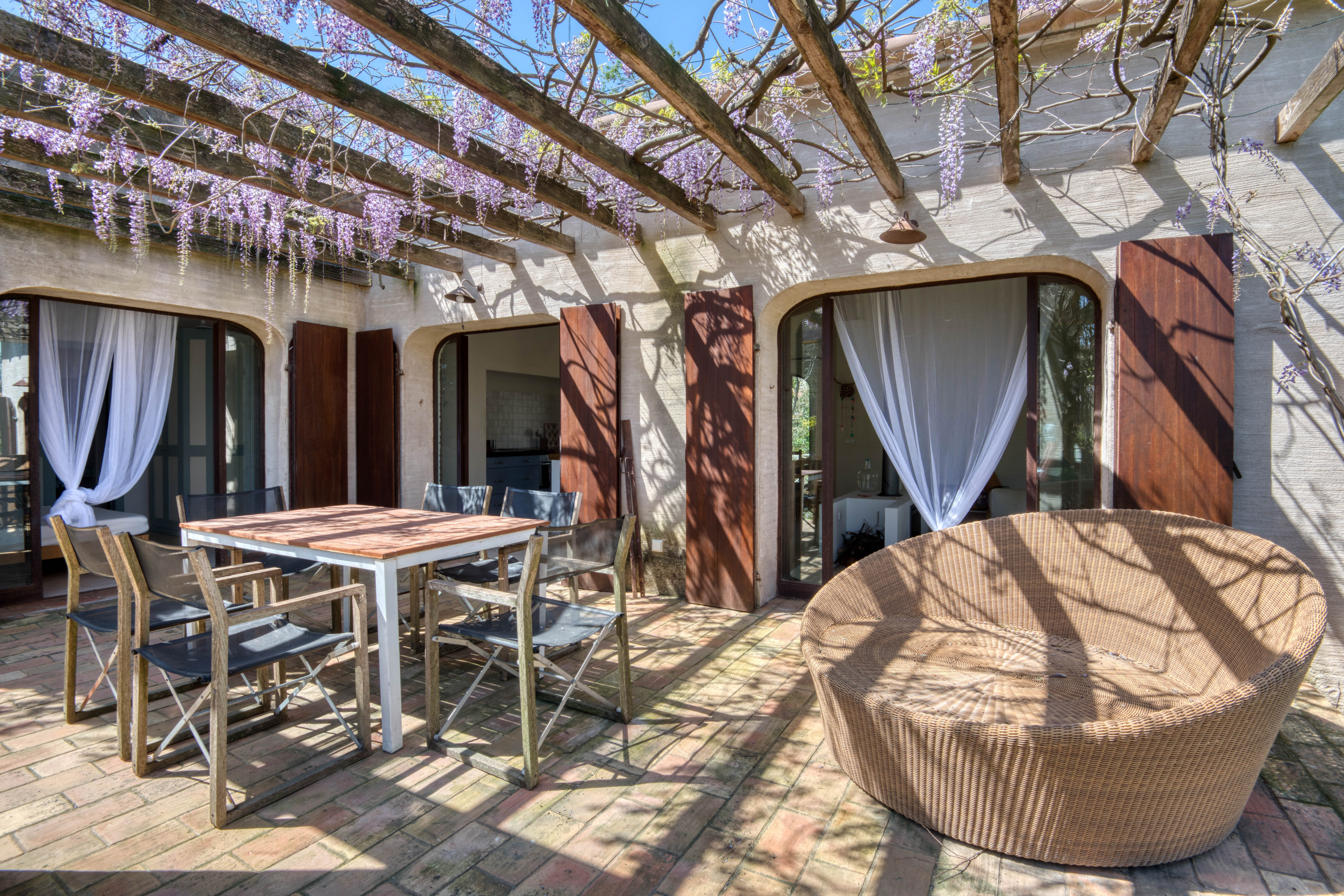 The exterior of the farmhouse is beautiful, with a beautiful garden, the private pool and full of flowers and plants create a unique space. In the porch area, different areas with tables and chairs, loungers to relax in the sun, a barbecue where you can prepare meals with friends and family, an outdoor shower, and a toilet and a bathroom with a shower.