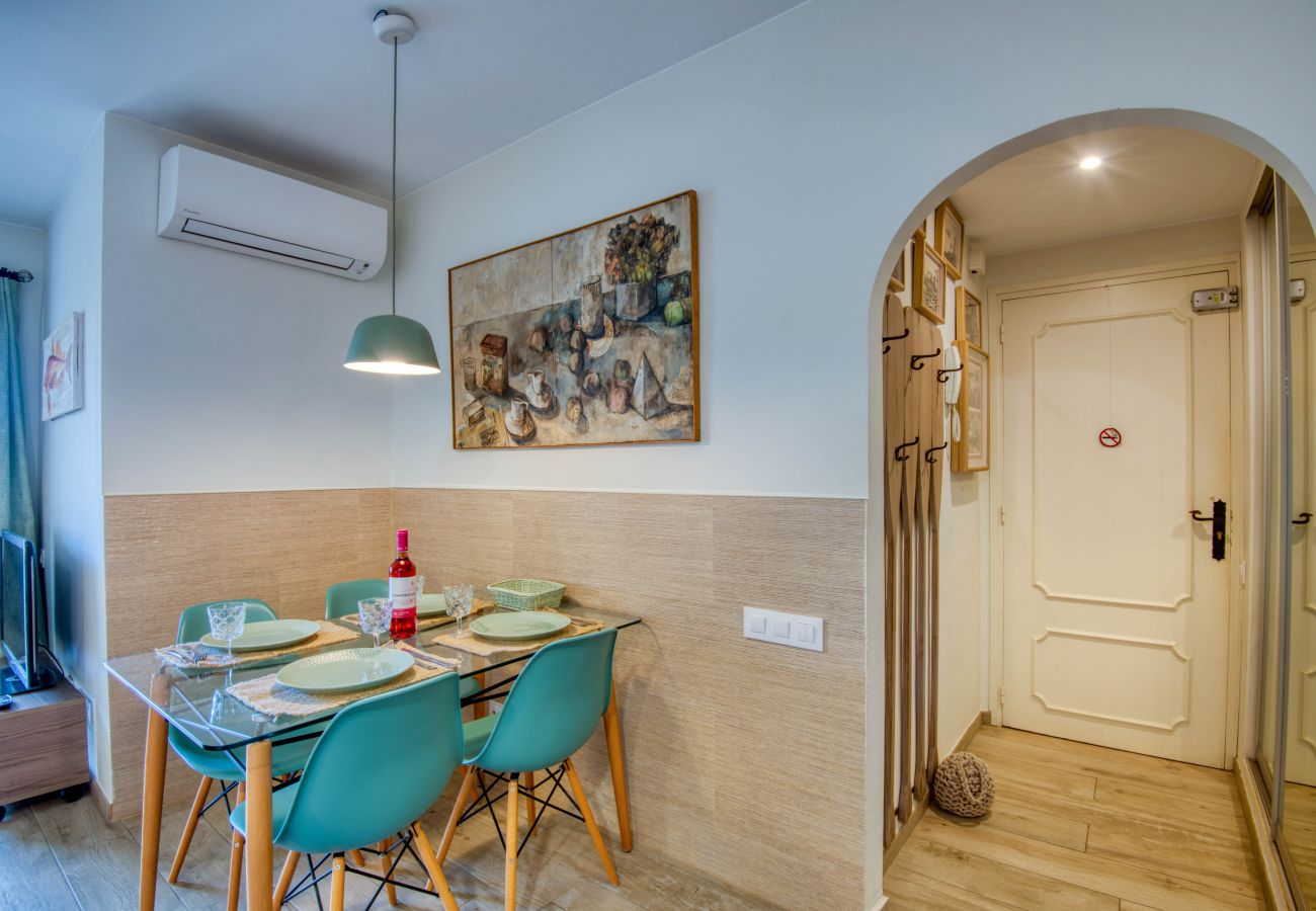 L'appartement est entièrement rénové. Il nous accueille avec un grand espace qui partagent une magnifique cuisine ouverte entièrement équipée, et le salon-salle à manger avec sortie directe sur la terrasse. Il dispose de deux chambres et d'une salle de bain avec douche. La première chambre est équipée d'un lit de couple et la seconde avec des lits individuels.