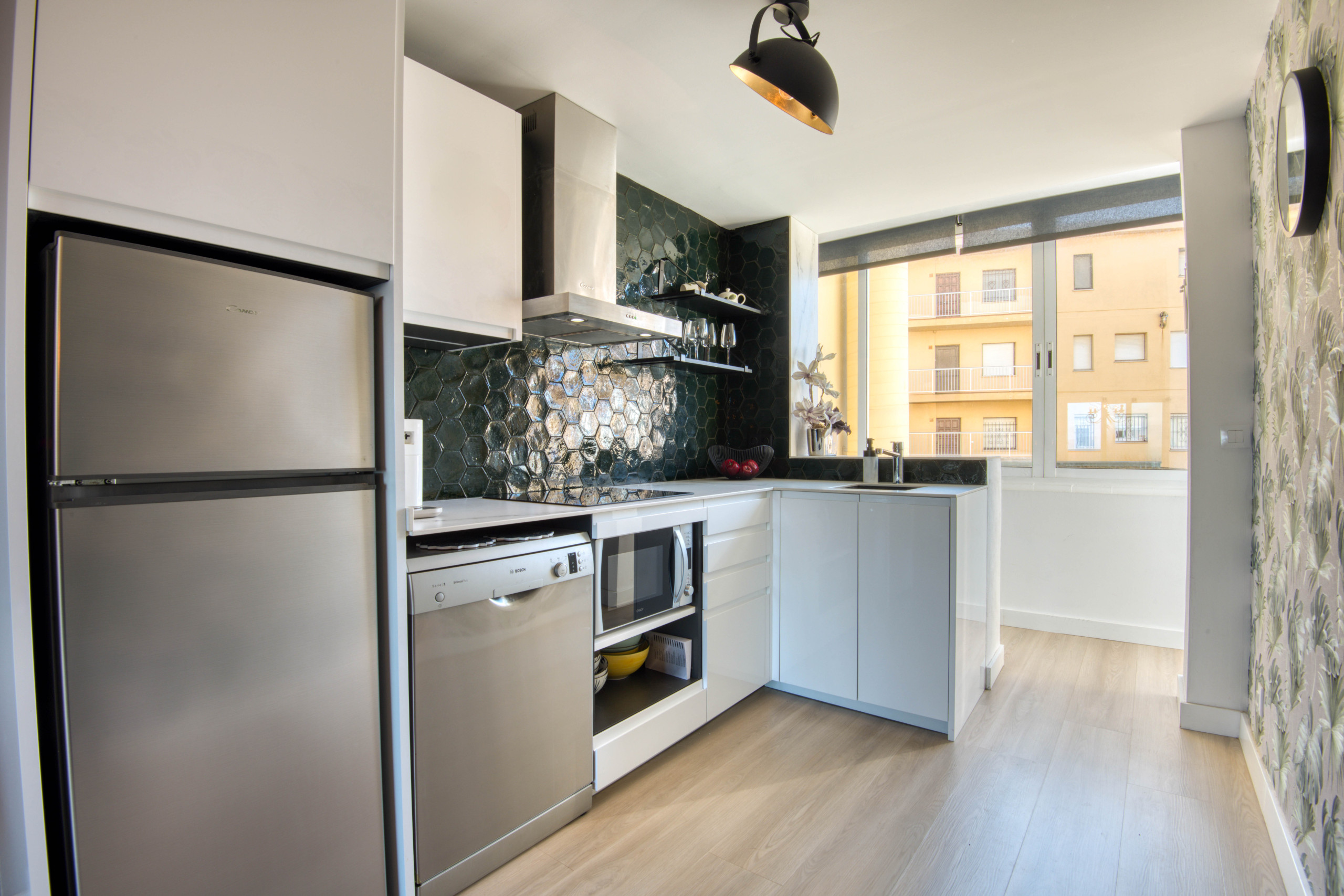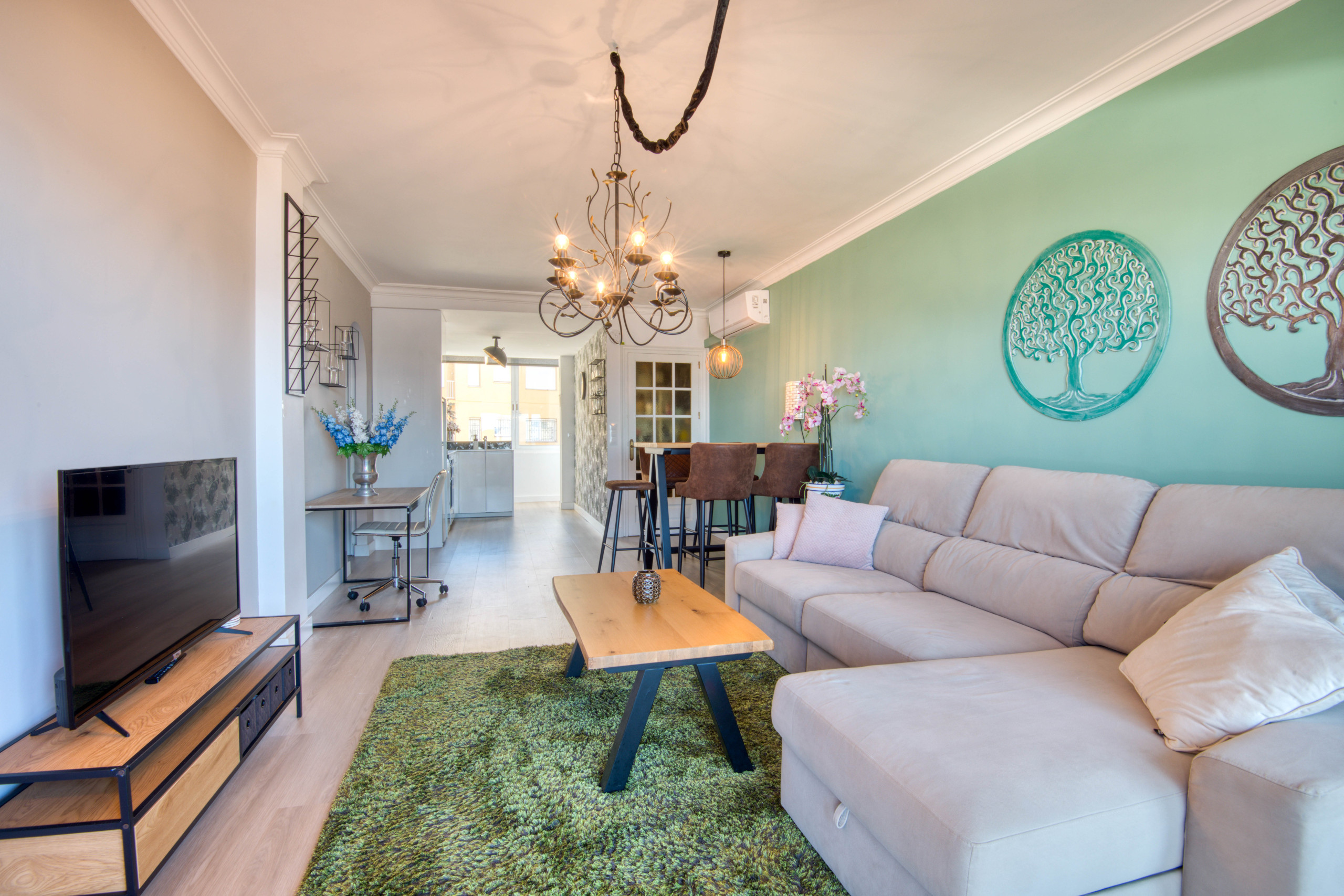 L'appartement est entièrement rénové. Il nous accueille avec un grand espace qui partagent une magnifique cuisine ouverte entièrement équipée, et le salon-salle à manger avec sortie directe sur la terrasse. Il dispose de deux chambres et d'une salle de bain avec douche. La première chambre est équipée d'un lit de couple et la seconde avec des lits individuels.