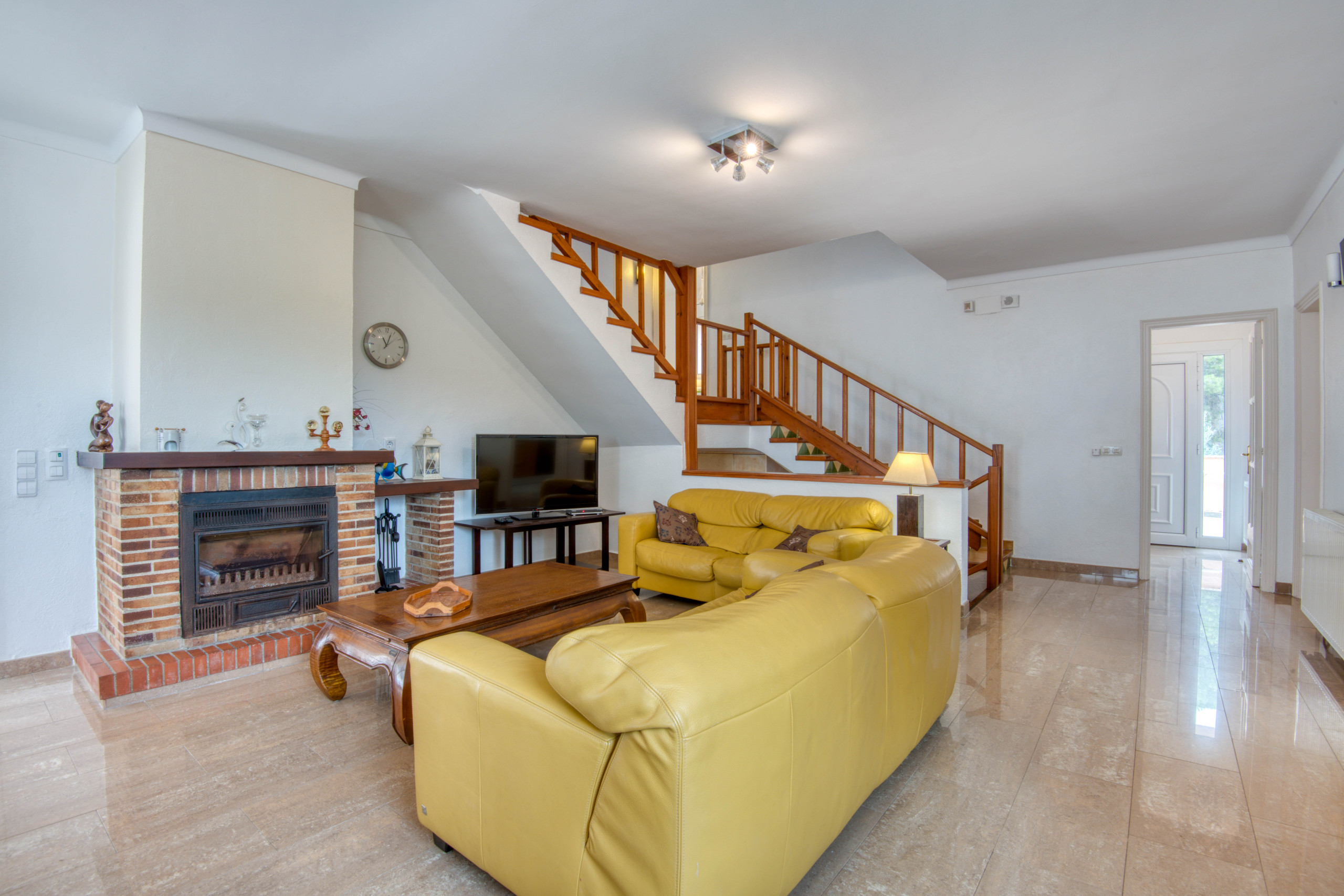 L'intérieur de la maison est divisé en deux étages. Au rez-de-chaussée, une grande cuisine indépendante entièrement équipée, le salon-salle à manger, une salle de bains avec douche et une chambre à coucher double avec lit double et armoire. A cet étage, il y a une unité de climatisation dans la chambre. L'escalier nous conduit au premier étage où se trouvent : une chambre à coucher avec deux lits simples et une armoire ; une deuxième chambre à coucher avec un lit double, des armoires et un accès au balcon de l'étage supérieur, avec vue sur la piscine ; une troisième chambre à coucher également avec un lit double, des armoires et un accès au balcon ; et enfin une salle de bains complète avec baignoire. À cet étage, il y a trois unités de climatisation, une dans chaque chambre.