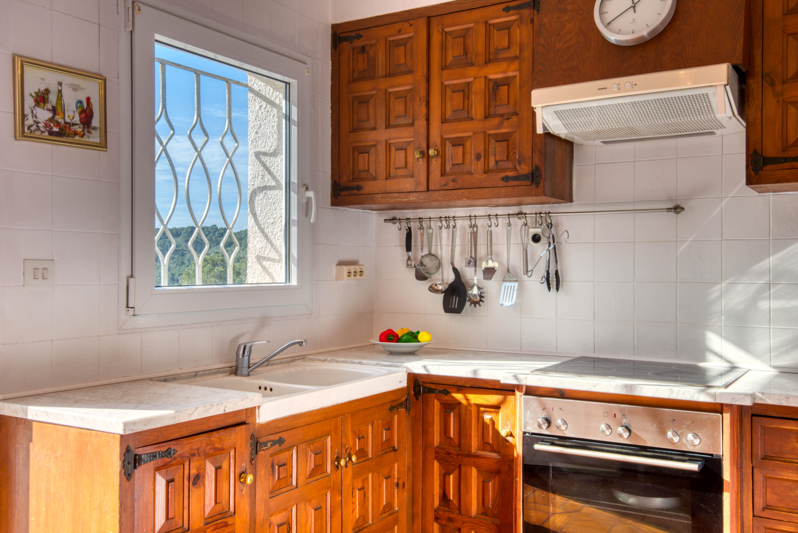 L'intérieur de la maison est divisé en deux étages. Au rez-de-chaussée, une grande cuisine indépendante entièrement équipée, le salon-salle à manger, une salle de bains avec douche et une chambre à coucher double avec lit double et armoire. A cet étage, il y a une unité de climatisation dans la chambre. L'escalier nous conduit au premier étage où se trouvent : une chambre à coucher avec deux lits simples et une armoire ; une deuxième chambre à coucher avec un lit double, des armoires et un accès au balcon de l'étage supérieur, avec vue sur la piscine ; une troisième chambre à coucher également avec un lit double, des armoires et un accès au balcon ; et enfin une salle de bains complète avec baignoire. À cet étage, il y a trois unités de climatisation, une dans chaque chambre.