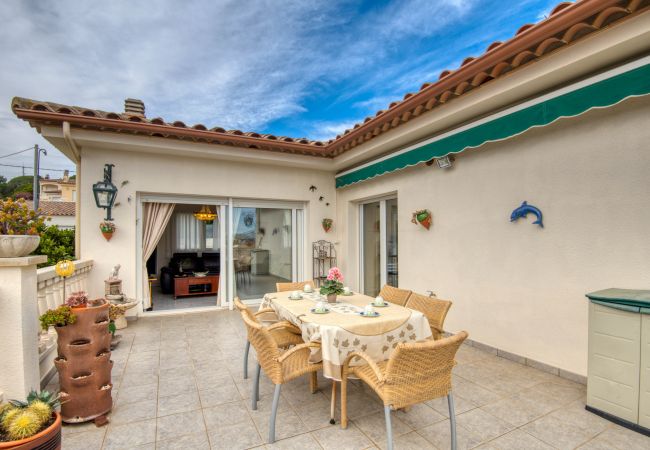 Maison à L'Escala qui possède 4 chambre(s). Logement de 250 m². La location se trouve à 400 m de la plage de sable, 500 m du supermarché.Elle dispose de clôture, terrasse,...